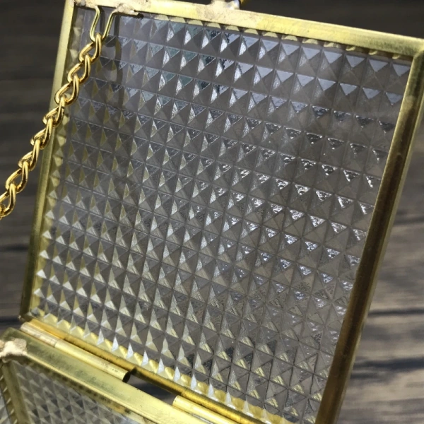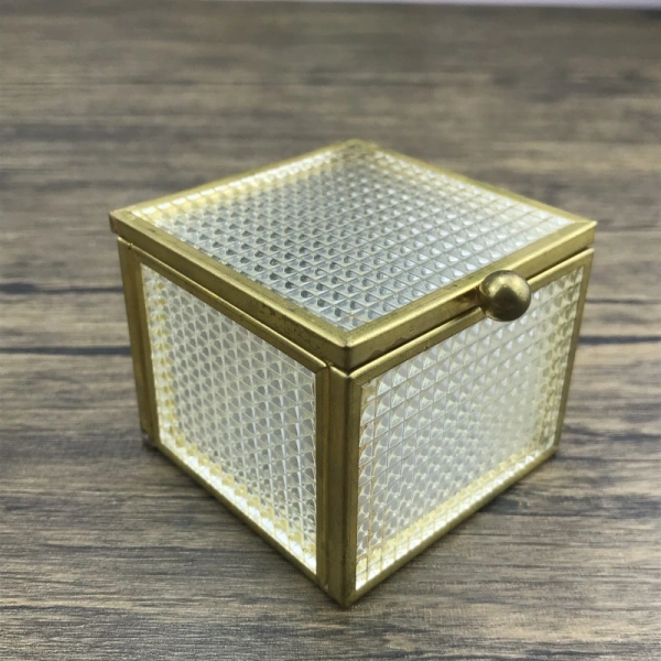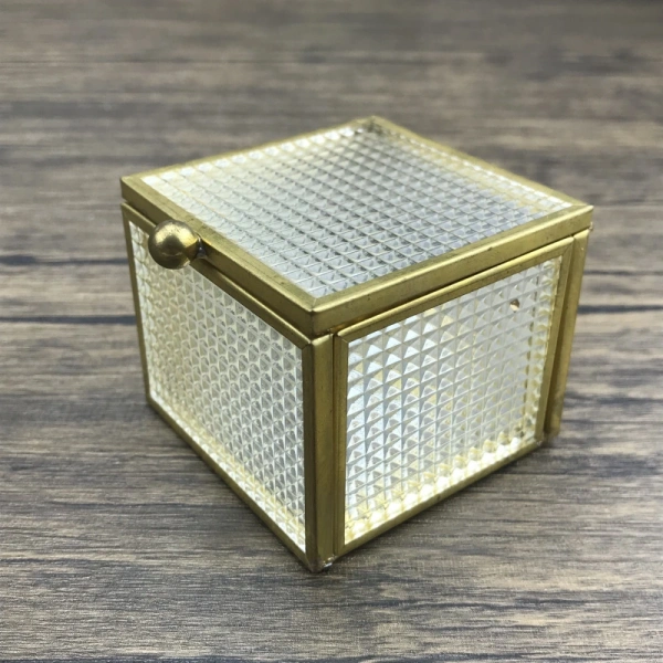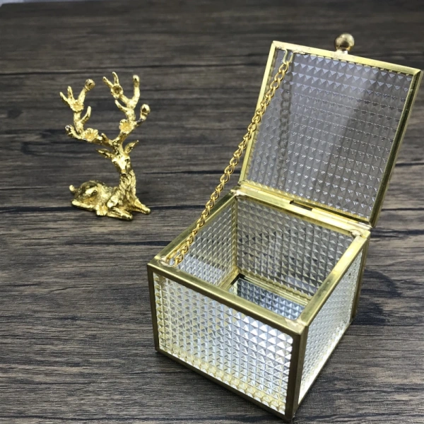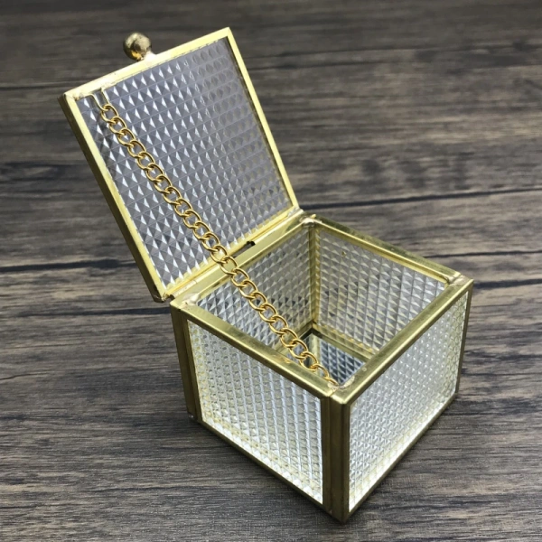 • This elegant mini square glass jewelry box is crafted with a golden copper frame and clear glass panels, combining modern simplicity with timeless charm.